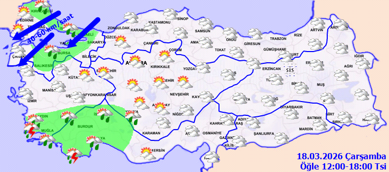 Meteoroloji Genel Müdürlüğü tarafından yapılan son değerlendirmelere göre: Ülkemizin batı kesimlerinin genelinin parçalı ve yer yer çok bulutlu, Marmara (Edirne ve Çanakkale haric), Kıyı Ege, Batı Akdeniz ile Manisa ve Denizli çevrelerinin yağmur ve sağanak yağmurlu geçmesi bekleniyor. Rüzgarın, Marmara’da kuzey ve kuzeydoğu yönlerden kuvvetli (40-60 km/sa) olarak esmesi bekleniyor. Gece ve sabah saatlerinde kuzey ve doğu bölgelerde buzlanma ve don olayı ile birlikte sis ve pus hadisesi tahmin ediliyor. Doğu Karadeniz’in iç kesimlerinin yüksekleri ile Doğu Karadeniz ve Doğu Anadolu’nun yüksek kar örtüsüne sahip eğimli kesimlerinde çığ tehlikesi ile kar erimesi tehlikesi bulunmaktadır.