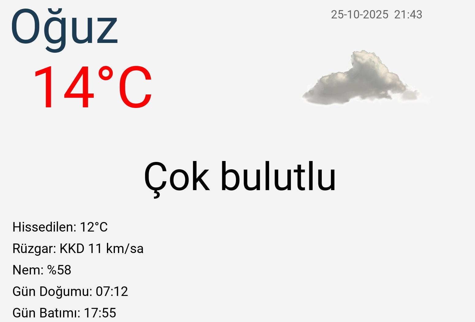 Oğuz'da bu hafta hava sıcaklıklarında düşüş yaşanacak. Bugün ılık ve rahat bir sıcaklık bekleniyor. Ancak 0.1mm yağış beklentisi bulunuyor. Oğuz'da hava durumunun parçalı bulutlu olması bekleniyor. En yüksek sıcaklığın 22°C, en düşük sıcaklığının ise 14°C olacağı tahmin ediliyor. Havanın yağışlı olma ihtimali %56 civarında olurken, yaklaşık 0.1mm oranında yağış bekleniyor. Rüzgârın güney batı 12 km/sa hızında, çoğunlukla orta şiddette, ara sıra hafif esintili olarak esmesi bekleniyor. Hava kalitesi iyi derecede olacak. Gökyüzündeki bulutların yoğunluğu %9 oranında. Bugünkü hava şartlarında görüş uzaklığının yaklaşık 16 km olacağı tahmin ediliyor. Oğuz'un nem oranı %60 civarında beklenirken, çiy noktası 7°C ve basınç değerinin 1014 mb olması bekleniyor.