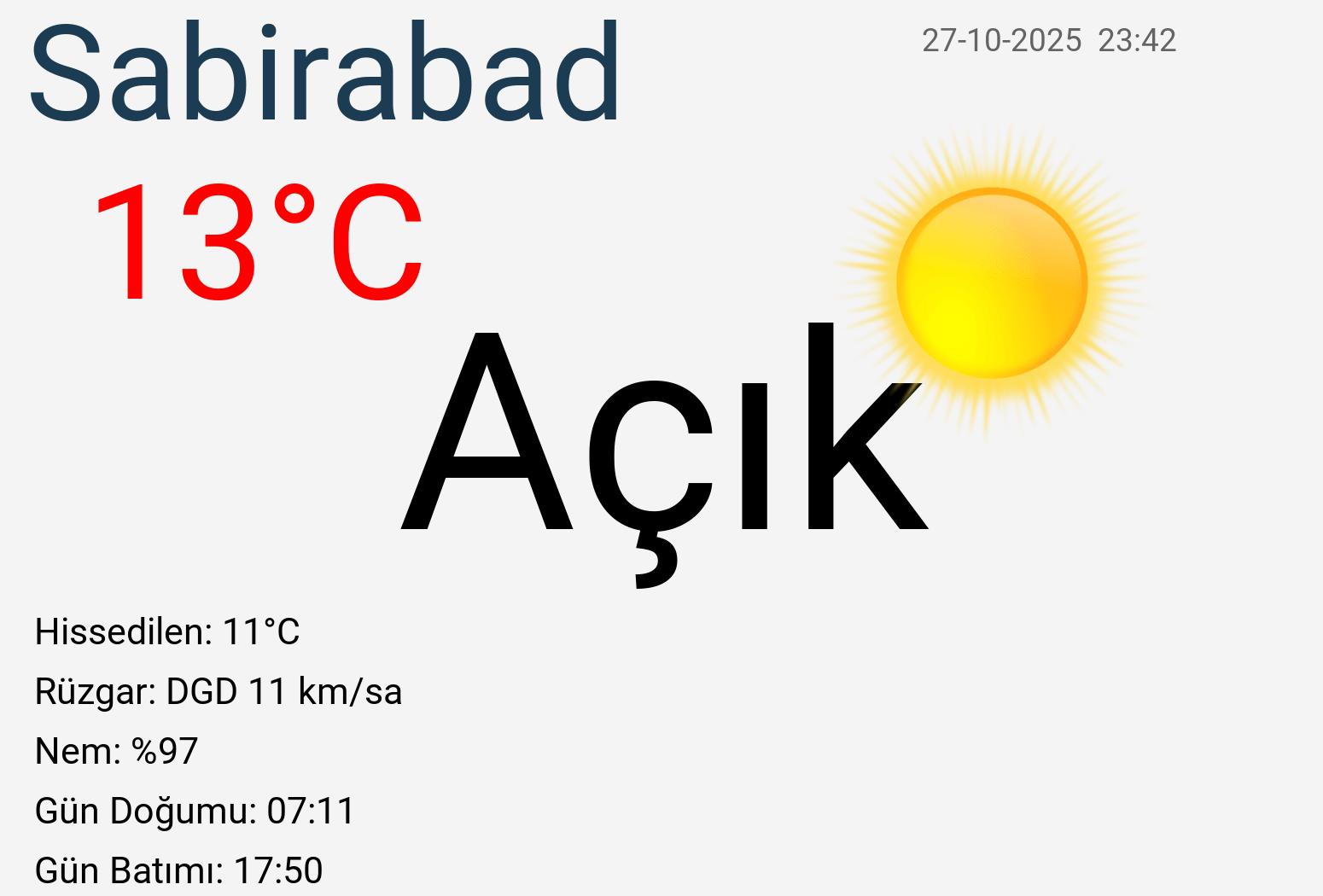 Sabirabad'da bu hafta boyunca hava sıcaklıklarında önemli bir değişiklik yaşanmayacak. Bugün daha ılık bir sıcaklık bekleniyor. Herhangi bir yağış beklentisi ise bulunmuyor. Sabirabad'da hava durumunun güneşli olması bekleniyor. Bu geceki en düşük sıcaklığın 15°C civarlarında olması bekleniyor. Havanın yağışlı olma ihtimali %0 civarında olurken, Rüzgârın doğu güney doğu 12 km/sa hızında, çoğunlukla orta şiddette, ara sıra hafif esintili olarak esmesi bekleniyor. Hava kalitesi iyi derecede olacak. Gökyüzündeki bulutların yoğunluğu %0 oranında. Bugünkü hava şartlarında görüş uzaklığının yaklaşık 8 km olacağı tahmin ediliyor. Sabirabad'ın nem oranı %89 civarında beklenirken, çiy noktası 13°C ve basınç değerinin 1017 mb olması bekleniyor.