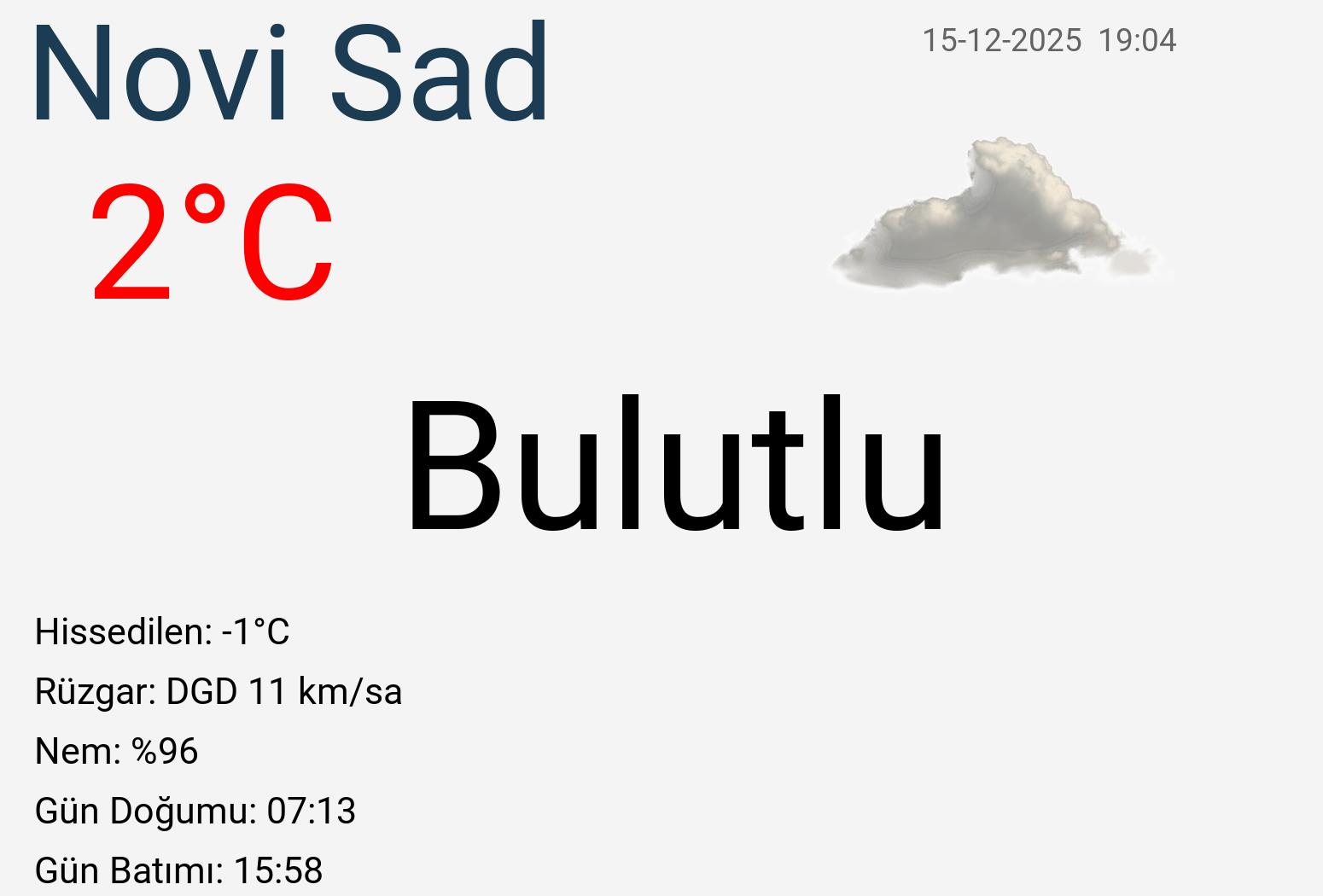 Novi Sad'da yarınki hava durumu ise; sabah saatlerinde olması bekleniyor. Yarın gün ortasında havanın , akşam saatlerinde , gece olacağı tahmin ediliyor.