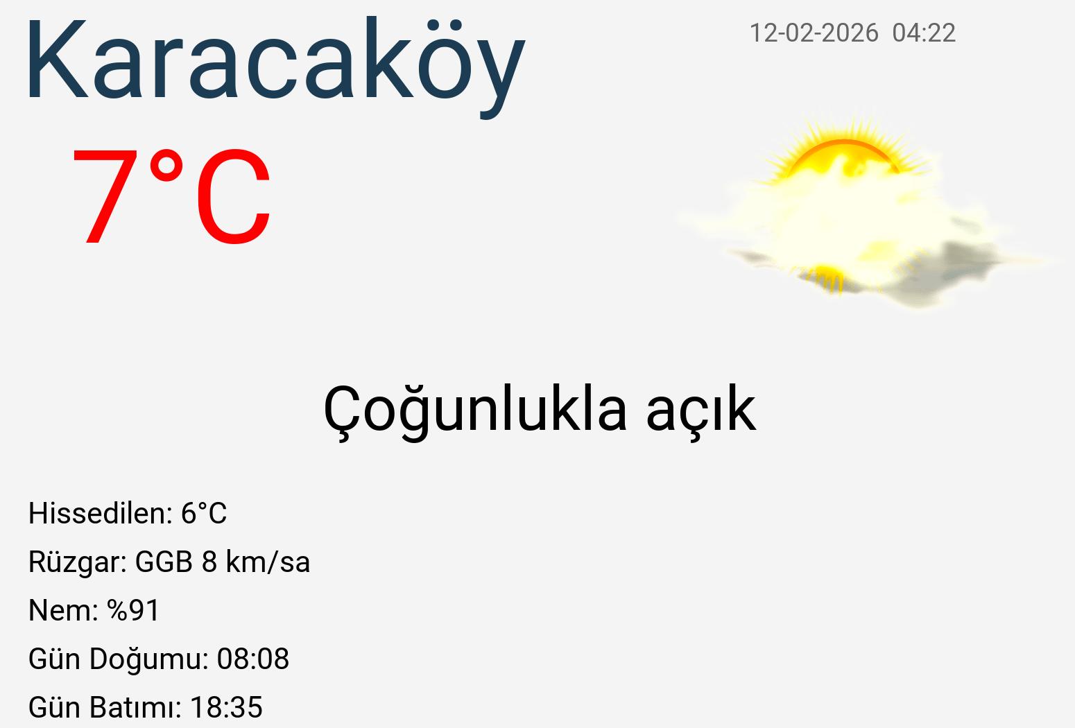 Karacaköy'de bu hafta hava sıcaklıklarında düşüş yaşanacak. Bugün hava durumunun yağmur ve hava bulutlu olması bekleniyor. En yüksek sıcaklığın 17°C, en düşük sıcaklığının ise 7°C olacağı tahmin ediliyor. Havanın yağışlı olma ihtimali %80 civarında olurken, yaklaşık 5.3mm oranında yağış bekleniyor. Rüzgârın güney güney batı 8 km/sa hızında, genellikle hafif esintili ve zaman zaman orta şiddette esmesi bekleniyor. Hava kalitesi Hassas Gruplar için Sağlıksız derecede olacak. Gökyüzündeki bulutların yoğunluğu %20 oranında. Bugünkü hava şartlarında görüş uzaklığının yaklaşık 24 km olacağı tahmin ediliyor. Karacaköy'ün nem oranı %91 civarında beklenirken, çiy noktası 6°C ve basınç değerinin ↓ 1005 mb olması bekleniyor.