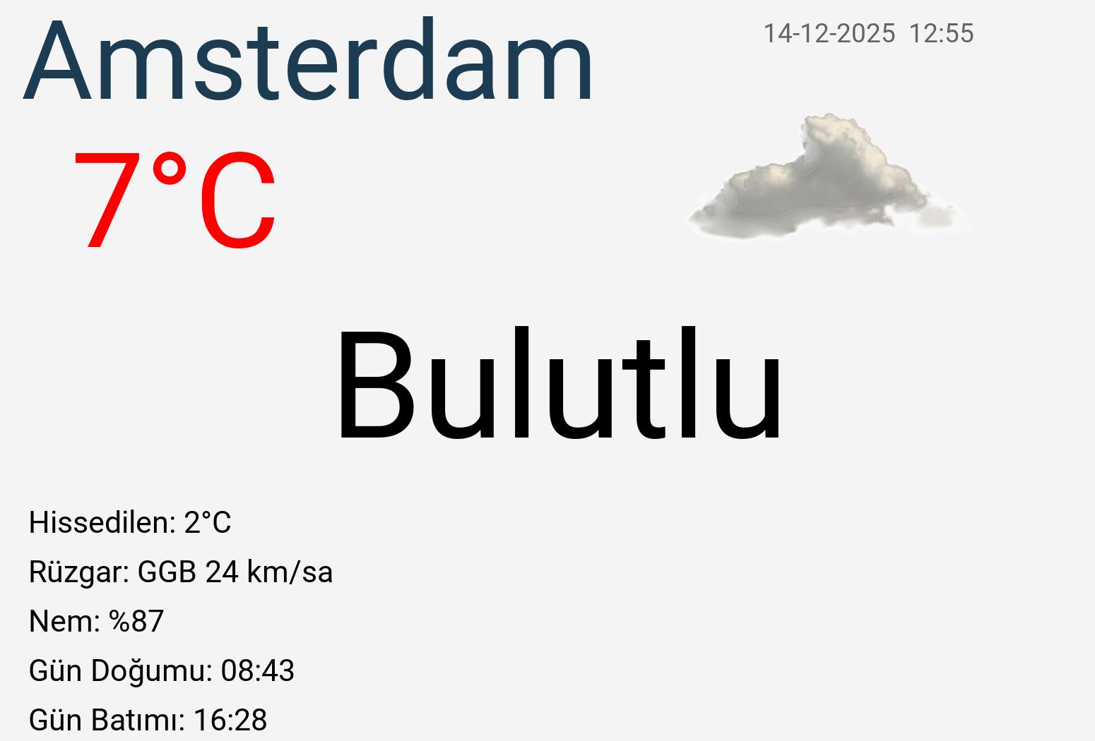 Amsterdam'da yarınki hava durumu ise; sabah saatlerinde parçalı bulutlu 5°C olması bekleniyor. Yarın gün ortasında havanın güneşli 8°C, akşam saatlerinde parçalı bulutlu 8°C, gece çok bulutlu 8°C olacağı tahmin ediliyor.