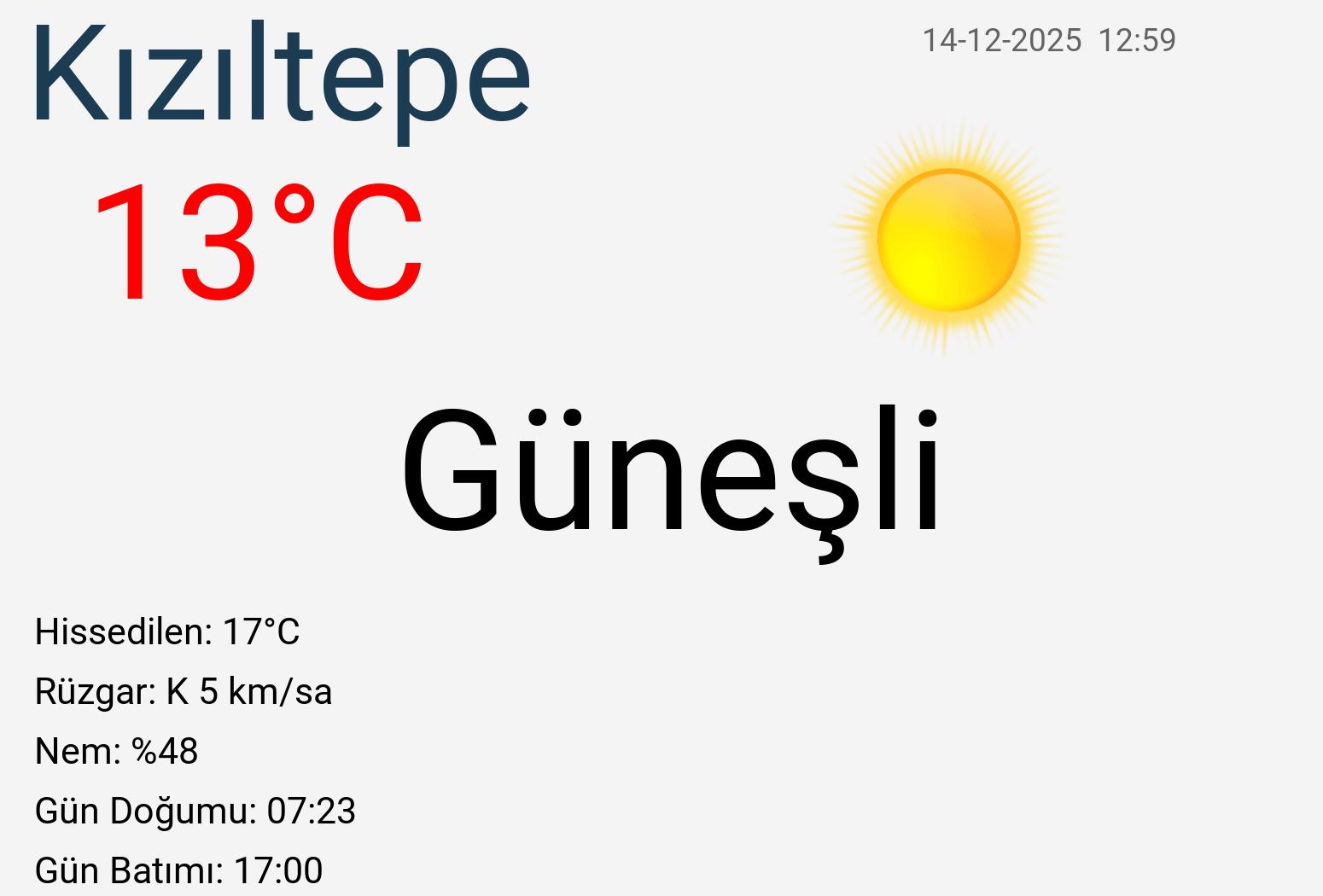 Kızıltepe'de bu hafta boyunca hava sıcaklıklarında önemli bir değişiklik yaşanmayacak. Kızıltepe'de hava durumunun güneşli olması bekleniyor. Bu geceki en düşük sıcaklığın 7°C civarlarında olması bekleniyor. Havanın yağışlı olma ihtimali %5 civarında olurken, Rüzgârın güney doğu 5 km/sa hızında, genellikle sakin ve ara sıra hafif esintili olması bekleniyor. Hava kalitesi iyi derecede olacak. Gökyüzündeki bulutların yoğunluğu %0 oranında. Bugünkü hava şartlarında görüş uzaklığının yaklaşık 16 km olacağı tahmin ediliyor. Kızıltepe'nin nem oranı %60 civarında beklenirken, çiy noktası 3°C ve basınç değerinin 1020 mb olması bekleniyor.
